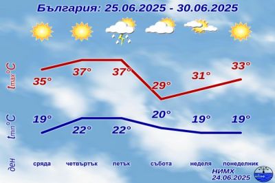 Най-горещият ден тази седмица се очертава да е четвъртък, 26 юни. Тогава градусите се очаква да скочат до 39.