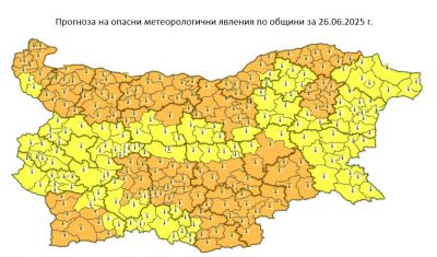 Орнажев код за екстремно високи температури е обявен за голяма част от страната за четвъртък 26 юни, показва справка в сайта на НИМХ.