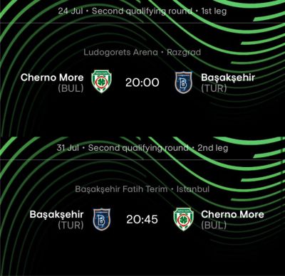 УЕФА официално потвърди часовете и датите за предстоящите европейски двубои на Черно море. Варненският тим ще се изправи срещу турския Истанбул Башакшехир на 24 юли от 20 часа в Разград, а ответният мач на стадион „Башакшехир Фатих Терим“ в Истанбул ще е на 31 юли от 20:45 часа.