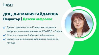 Доц. д-р Мария Гайдарова е педиатър и детски нефролог с дългогодишна практика в Клиниката по детска нефрология и хемодиализа към СБАЛДБ – София. Тя има защитена дисертация върху остри нефрити в детска възраст и е специализирала в Гърция. Притежава богат опит в диагностиката и лечението на инфекции и вродени аномалии на пикочните пътища.
