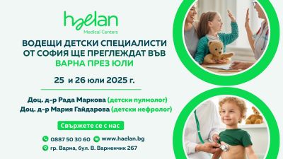 На 25 и 26 юли 2025 г. родителите във Варна ще имат възможността да запазят час за децата си при двама от най-изявените специалисти в областта на детската пулмология и нефрология – доц. д-р Рада Маркова (детски пулмолог) и доц. д-р Мария Гайдарова (детски нефролог). Прегледите ще се извършват в Медицински център Хейлан Кеър – Варна след предварително записване на тел. 0887 50 30 60.