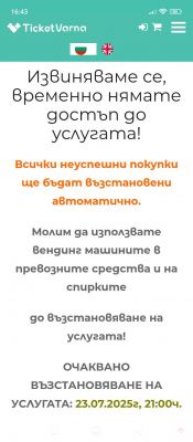 Според съобщение в приложението електронната система няма да бъде достъпна до около 21:00 ч. днес. Гражданите се приканват да използват алтернативната възможност – автоматите за издаване на хартиени билети, разположени по спирките и в самите превозни средства.