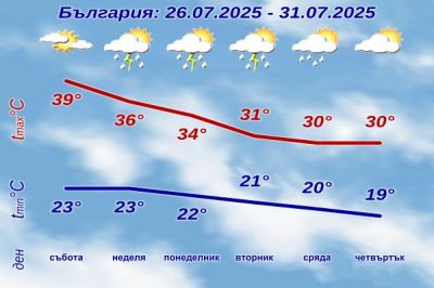 В неделя над северозападните райони, след обяд и в планините в Югозападна България, ще се развива купеста и купесто-дъждовна облачност; на места там ще има краткотрайни валежи и гръмотевици. Над останалата част от страната ще се задържи предимно слънчево. С обръщане на вятъра от северозапад ще започне да прониква сравнително хладен въздух и през първата половина от следващата седмица температурите ще се понижат – отначало в Северна България, а във вторник вече преобладаващите максимални ще бъдат между 29° и 34°.