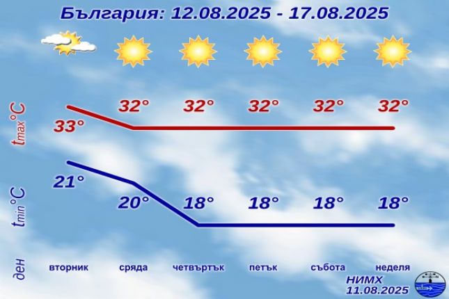 Във вторник ще има временни увеличения на облачността. Ще е почти без валежи, само на отделни места в планините след обяд е възможно да превали краткотрайно. Ще продължи да духа слаб до умерен вятър от изток-североизток. Дневните температури ще се понижат с 3-4 градуса. През следващите дни до края на седмицата ще бъде слънчево и сухо, с преобладаващи максимални температури между 30° и 35°. Вятърът ще се запази от изток-североизток, но в повече райони по-често ще бъде умерен, към неделя ще отслабне.
