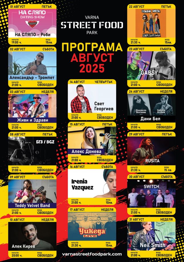 Всички събития започват в 21:00 ч. на любимата локация – Varna Street Food Park, Трета буна, крайбрежната алея.