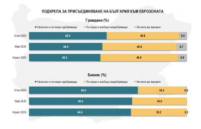 Според резултатите сред гражданите положителните нагласи са 49,2%, срещу 45,8% с отрицателно отношение – ръст от 3 процентни пункта спрямо май. Бизнесът показва още по-устойчиви положителни нагласи: 69% подкрепят присъединяването, а 30% са против.
