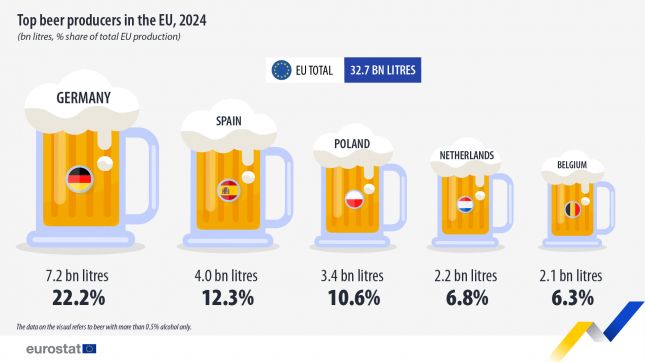 През 2024 г. страните от Европейския съюз са произвели общо 34,7 милиарда литра бира – 32,7 милиарда литра с алкохолно съдържание над 0,5% и 2 милиарда литра безалкохолна или с по-ниско съдържание на алкохол. Това сочат данни на Евростат.