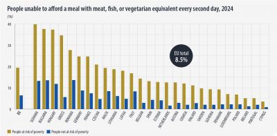 За сравнение, през 2024 г. средният дял в ЕС на хората, които не могат да си позволят пълноценно хранене, е 8,5% – с един процентен пункт по-нисък спрямо 2023 г.