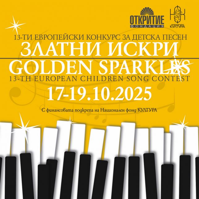 13-ото издание на Европейския конкурс за детски песни „Златни искри“ се организира от фондация „Откритие“ и се провежда благодарение на финансовата подкрепа на Национален фонд „Култура“.