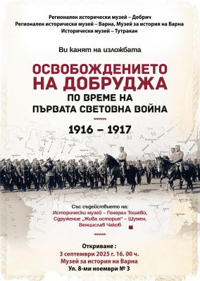 На 3 септември, сряда, от 16 часа в Музея за нова история на Варна ще бъде открита изложбата „Освобождението на Добруджа през Първата световна война 1916-1917“. Експозицията е съвместен проект на Регионален исторически музей – Добрич и Исторически музей – Тутракан.