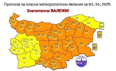 Оранжев код за опасно време и очаквани обилни валежи е обявен в областите Видин, Монтана, част от Враца, Ловеч, София област, Пазарджик, Пловдив, Смолян, Кърджали и малка част от Хасково.