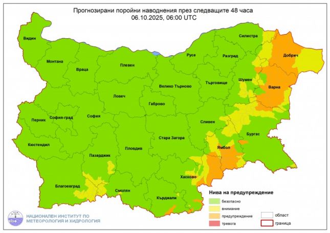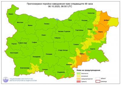 По данни на НИМХ, от вечерта на 6 октомври до обедните часове на 7 октомври е важно да се следи нивото на водите във водосборите на реките Батовска, Провадийска и Камчия, както и на техните по-малки притоци.