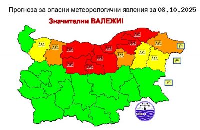 Националният институт по метеорология и хидрология (НИМХ) обяви червен код за опасни валежи в днешния 8 октомври за 7 области в Северна България – Силистра, Разград, Русе, Велико Търново, Плевен, Ловеч и Габрово.