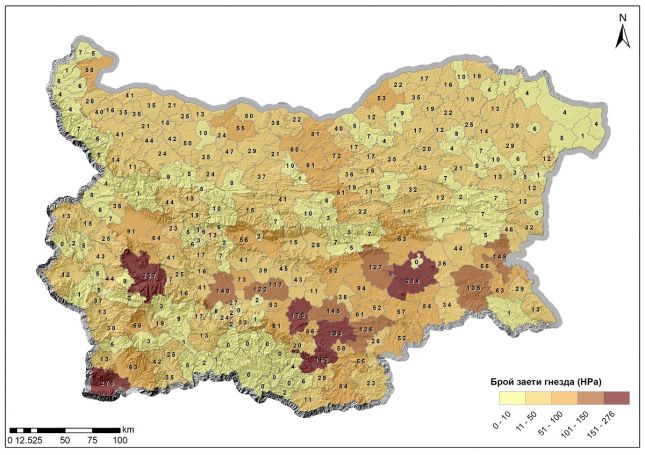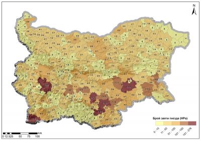 Села с най-много заети гнезда са Баня (Разлог) – 51, Рупите (Петрич) – 50, Райово (Самоков) – 48, Драгушиново (Самоков) – 46 и Кулата (Петрич) – 46. Сред градовете Бургас води класацията с 48 заети гнезда и общо 59 гнезда в рамките на населеното място.
