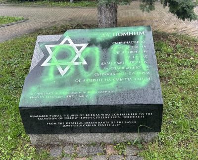 Паметникът на благодарността, изграден от Център за еврейско-българско сътрудничество и признателни потомци на спасени през Холокоста български евреи в памет на достойни граждани на Бургас, защитавали еврейското население в годините на преследвания и унищожение, е осквернен за втори път за последните два месеца.