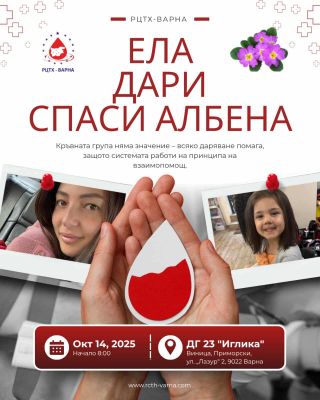 Във Варна ще се проведе акция за кръводаряване в подкрепа на Албена Станчева, която пострада тежко при инцидент по време на ралито край Аладжа манастир. Акцията ще се проведе на 14 октомври (вторник) в Детска градина „Иглика“, където ще бъде разположен мобилният център за кръводаряване.