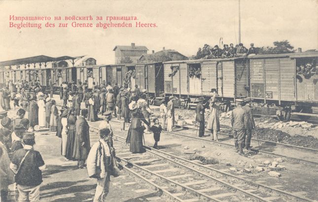 Влакова композиция със заминаващите войски и изпращачи на перона по време на Първата световна война.