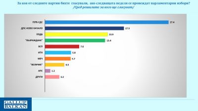 ГЕРБ-СДС запазва водеща позиция с 27,4% подкрепа сред решилите за кого ще гласуват, ако изборите се проведат следващата неделя. Това показват данните от последното национално представително проучване на „Галъп интернешънъл Болкан“.