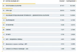 Данните от паралелно преброяване при 95% обработени секционни протоколи на агенция "Мяра: показват убедителна преднина за "Прогресивна България" с 45,3%.