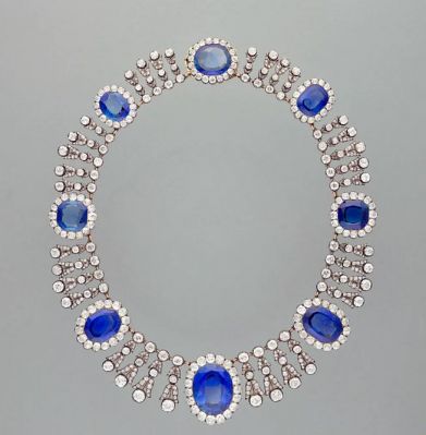 тиара, огърлица и единична обеца от сапфирения комплект на кралица Мария-Амели и кралица Хортензия;