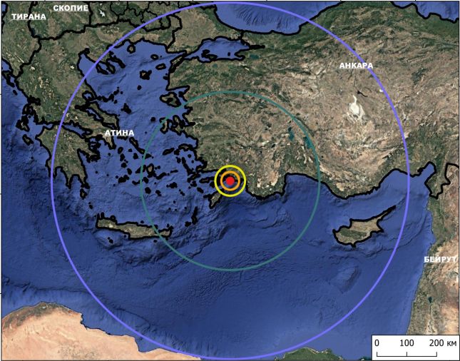 Трусът е бил регистриран в 05:45 ч. местно (и българско време) на дълбочина 30 километра, а епицентърът му е бил във водите на Егейско море между гръцкия остров Родос и бреговете на турския окръг Мугла, на разстояние 799 км от София.