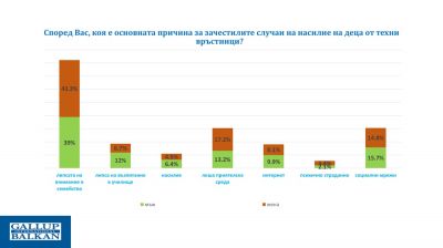 Най-честата причина за насилието между деца у нас е липсата на внимание в семейството. Това показва национално изследване на обществените нагласи, проведено от „Галъп Интернешънъл Болкан“, посветено на темата за насилието и по-специално на неговите прояви сред подрастващите.