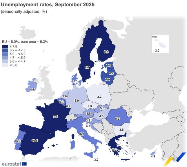 През изминалия септември нивото на безработица в еврозоната е било 6,3%, стабилно в сравнение с август, както и със септември 2024 г. Нивото на безработица в ЕС е било 6% през септември, също стабилно в сравнение с август 2025 г. и е нараснало спрямо 5,9% през септември 2024 г. Данните бяха публикувани от Евростат.