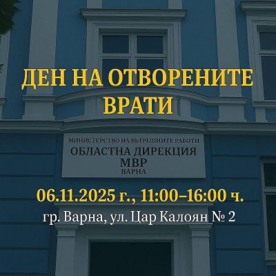 В навечерието на професионалния празник на българската полиция – 8 ноември, Областната дирекция на МВР – Варна ще проведе Ден на отворените врати. Събитието ще се състои на 6 ноември (четвъртък) от 11:00 до 16:00 часа в сградата на дирекцията на ул. „Цар Калоян“ № 2.