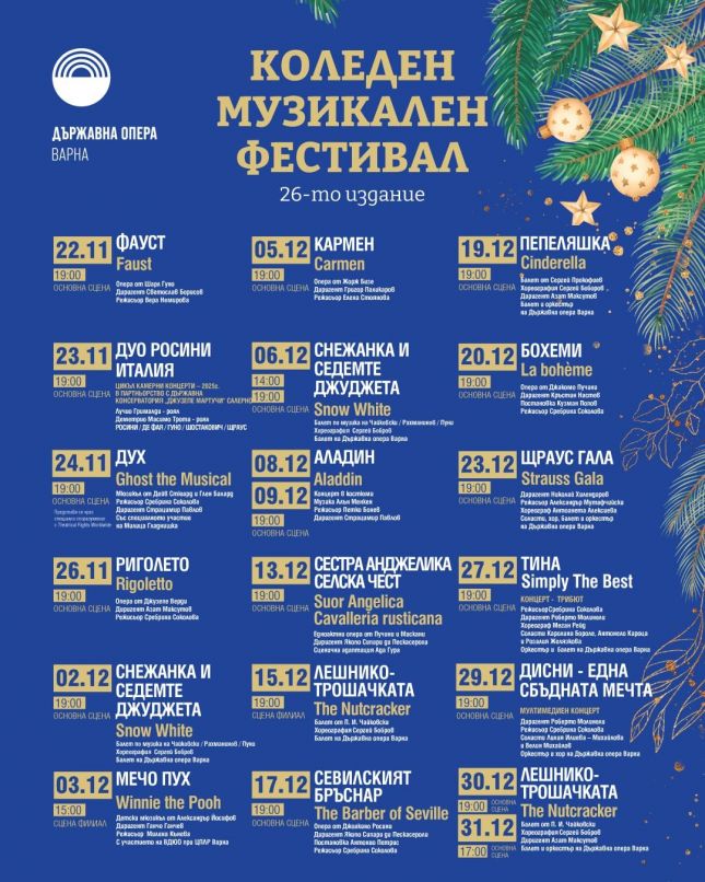 От 22 ноември до 31 декември 2025 г. в Държавна опера Варна ще се проведе 26-о издание на Коледния музикален фестивал – традиция, която повече от четвърт век носи на варненската публика вълшебството на класическото изкуство, балета и мюзикъла в празничния сезон.