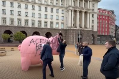 Депутатът от ДПС-Ново начало Станислав Анастасов надраска със спрей голямото розово прасе-касичка, което от "Продължаваме промяната" поставиха тази сутрин пред парламента. От ДПС съобщиха в социалните...
