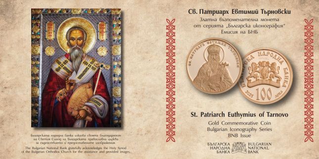Българската народна банка обяви, че от 24 ноември 2025 г. пуска в обращение златна възпоменателна монета на тема „Св. Патриарх Евтимий Търновски“ от серията „Българска иконография“. Автори на проекта са Пламен Чернев и Преслав Чернев. Цената при пускане е 2 590 лева (1324.25 евро).