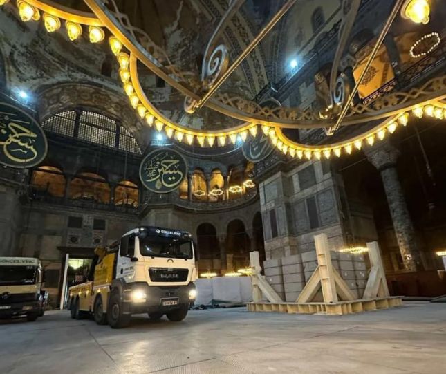 Появата на тежък кран във вътрешността на Голямата джамия „Света София“ в Истанбул предизвика широк обществен дебат и сериозни въпроси относно начина, по който се извършват текущите реставрационни дейности. Снимки от мястото показаха кран, монтиран на камион, разположен върху историческия под на монумента, като под колелата му са поставени временни защитни панели.