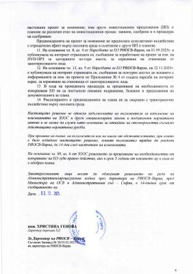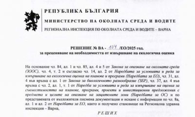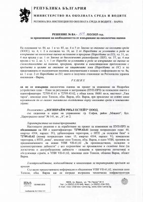 Контролният орган РИОСВ Варна е провел процедура по преценяване на необходимостта от извършване на екологична оценка на ПУП за „Изграждане на производствено складова база“, находяща се в ПИ №72709.43.61 и ПИ №72709.43.62 по КККР на с Тополи, община Варна, област Варна. с които се предвижда обединяване на ПИ и промяна на предназначението на новия имот - За производствени, складови и административни дейности и е постановил Решение № ВА-104/ЕО/2025 със заключение „ДА НЕ СЕ ИЗВЪРШВА ЕО“, достъпно за информация при инвеститора на посочения адрес - гр. София, р-н Младост, бул. „Цариградско шосе“, 141, вх. А, ет. 2 и на следния линк: https://riosv-varna.bg/Prevantivna%20dejnost/pr%20EO/2025/104-.pdf .