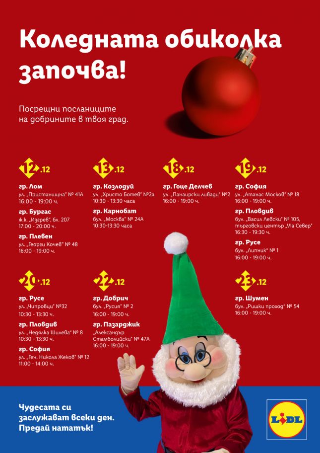 Празничната кула с подаръци на Lidl ви очаква на Немския коледен базар, а Джуджето, Броколино и Крушана ще отнесат посланието ѝ до 14 града в страната