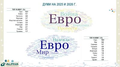 Според анкетираните думата, която най-силно характеризира 2025 г., е „евро“ – процес, започнал през настоящата година и очакван да приключи с въвеждането на единната валута през 2026 г. Следват противопоставянето „война“ за 2025 г. и „мир“ като надежда за следващата година, както и „инфлация“, която остава водещо притеснение.