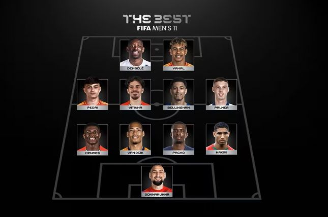 Най-добрите 11 футболисти за годината при мъжете са: При мъжете: Джанлуиджи Донарума, Ашраф Хакими, Уилиан Пачо, Върджил ван Дайк, Нуно Мендеш, Коул Палмър, Джуд Белингам, Витиня, Педри, Ламин Ямал и Усман Дембеле.