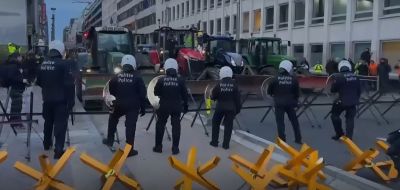 Сблъсъци с полицията последваха, след като трактори блокираха пътища в района на Европейския парламент, а протестиращите запалиха фойерверки и хвърляха картофи и яйца.