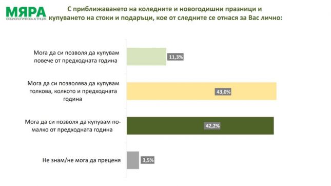 Само около 10% от българите смятат, че могат да купуват повече стоки и подаръци за Коледа и Нова година спрямо миналата година. 43% твърдят, че разполагат с приблизително същите възможности, а 42,2% признават, че купуват по-малко.