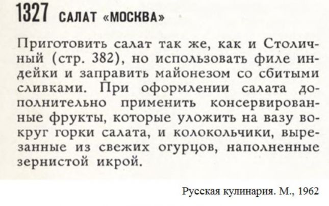 Книгата „Руска кухня“, публикувана през 1962 г., съдържа рецепта за салата „Москва“, която по същество е същата като салата „Столична“. Вместо пилешко или дивеч обаче се препоръчва да се използва варено пуешко филе, а салатата да се гарнира с червен хайвер, поставен върху пресни краставици.