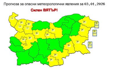 Жълт код за силен вятър е обявен за Варна и още 13 области в страната за днес, 3 януари.
