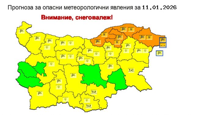 За област Варна има обявен жълт код. В региона ще духа силен североизточен вятър и в комбинация със снеговалежите ще има условия за виелици и навявания.