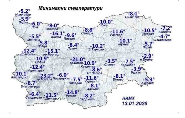 Днес в страната беше отчетено най-студеното утро от началото на зимата, като на много места температурите паднаха доста под нулата. Най-ниската измерена стойност е в Кнежа – минус 16,1 градуса по Целзий, отчитат от Националния институт по метеорология и хидрология (НИМХ).