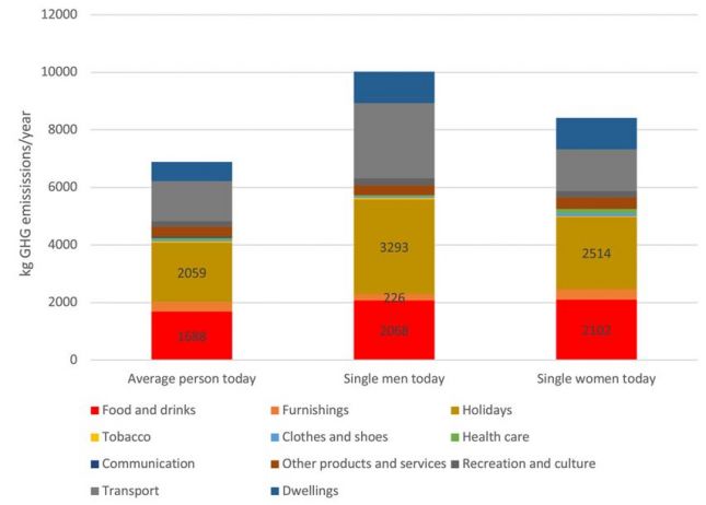 Анализът сравнява несемейните мъже и жени в Швеция и установява, че консумираната храна и почивките са причината за над половината от всички емисии и за двата пола. Тук основните разлики между половете са в перата “ваканции” и “транспорт”.