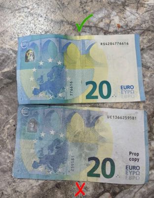 Става въпрос за банкнота, която визуално наподобява истинско евро, но е реквизитна и няма реална парична стойност. При оглед са забелязани характерни несъответствия със стандартите на истинските евро банкноти – липса на защитни елементи, отсъствие на релеф при допир и неактивна холограма.