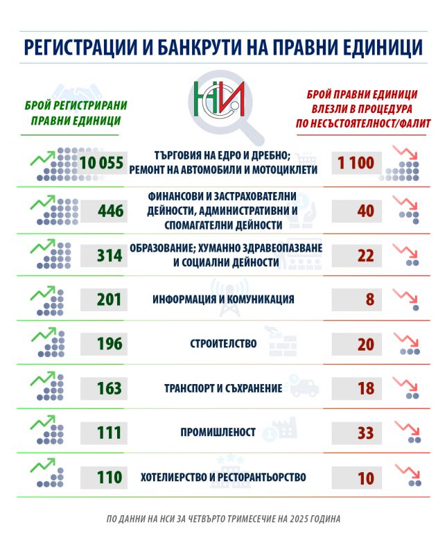 През четвъртото тримесечие на 2025 г. в България са регистрирани 11 596 нови правни единици, докато 1 251 фирми са влезли в процедура по несъстоятелност или са обявени в несъстоятелност. В сравнение със същия период на 2024 г., новорегистрираните компании се увеличават с 4.1%, а банкрутиралите – със 7.4%, информират от НСИ.