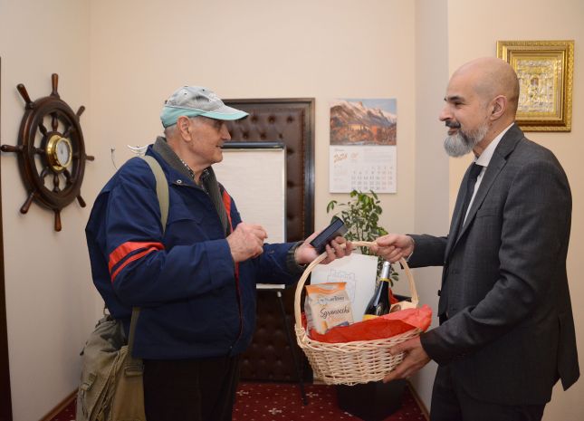 Ръководството на Общината го изненада в кметския кабинет, където заместник-кметът Павел Попов му връчи специален плакет и поздравителен адрес от името на кмета Благомир Коцев.