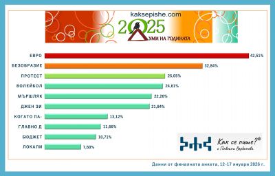 Инициативата за пета поредна година откроява най-важните теми за изминалите 12 месеца през употребата на думите както сред хората, така и в медиите. Във финалната анкета всеки можеше да гласува за три думи и изрази, които са белязали 2025-а, а медийният анализ отново е предоставен от системата за глобален медиен мониторинг Sensika. Неизненадващо думата, която е отбелязана и в двете класации, е „евро“.