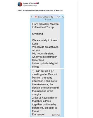 Президентът на САЩ Доналд Тръмп сподели в нощни публикации в социалните мрежи лични съобщения от световни лидери, свързани с Гренландия. Сред тях е и послание от френския президент Еманюел Макрон, в което той пише: „Не разбирам какво правите в Гренландия.“