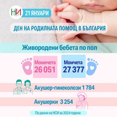 През 2024 г. в България са регистрирани 53 428 живородени бебета, сочат данните на Националния статистически институт. От тях 27 377 са момчета, а 26 051 – момичета. В страната работят 1 784 акушер-гинеколози...