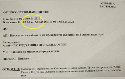 Вчера от Прессекретариата на Президенството съобщиха, че официалната междуинституционална кореспонденция, чрез която държавният глава Румен Радев е получил поканата от президента на САЩ Доналд Тръмп да представлява България в Съвета за мир, е постъпила в президентската институция на 20 януари. От там посочиха, че спекулациите по темата от страна на министъра на външните работи са некоректни и противоречат на фактите.